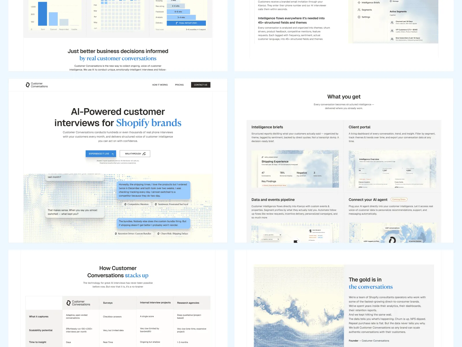 Strategy. We positioned Customer Conversations against surveys specifically — the closest mental reference point and the category with the weakest results. Leading with '10–20× higher completion than surveys' made the product instantly gradeable. Not 'a new category you have to learn' — 'the thing surveys were supposed to be.'
