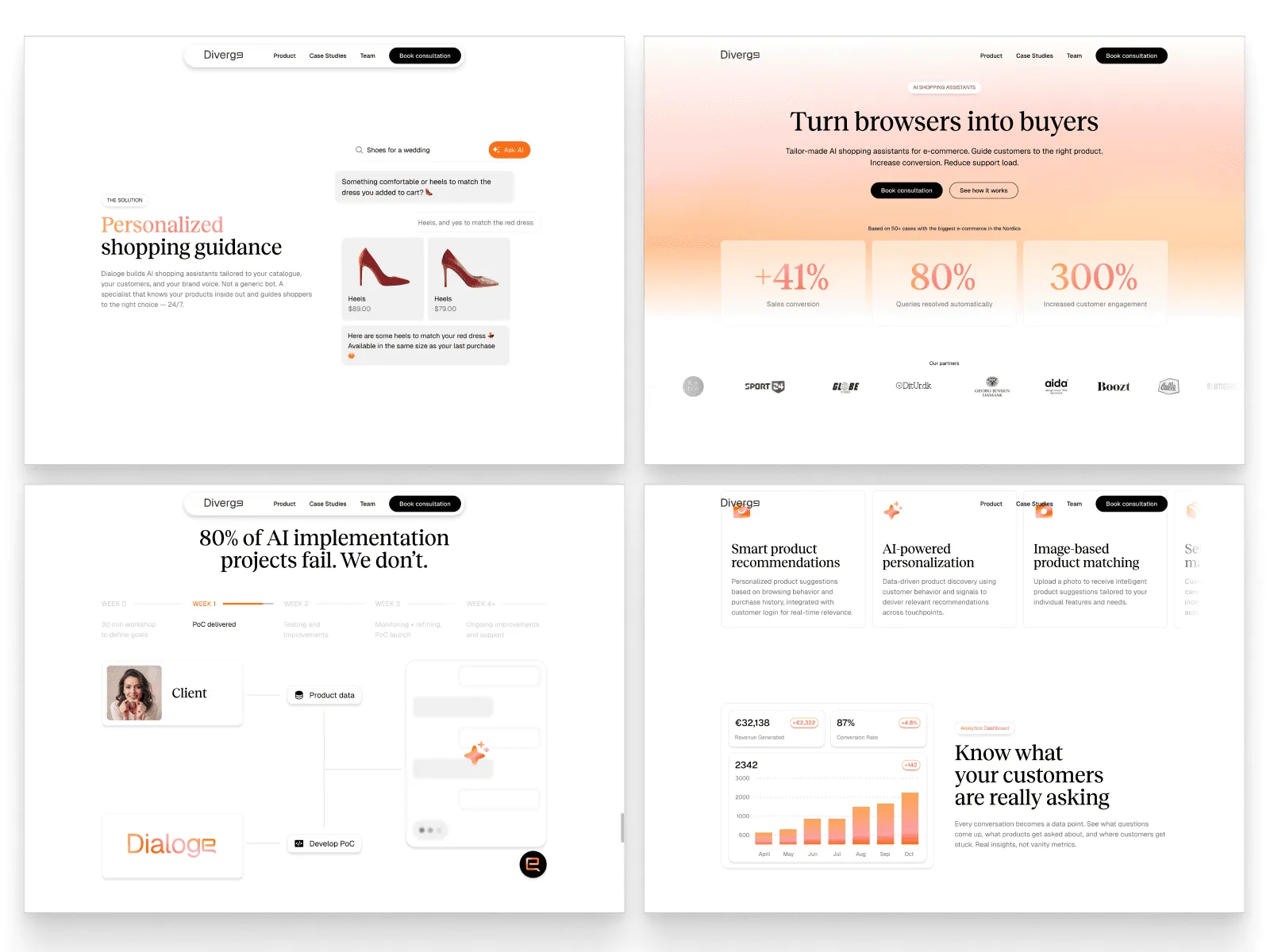 Diverge (formerly Dialoge) is an AI shopping assistant that works alongside e-commerce brands to convert browsers into buyers and resolve customer service at scale. Before our engagement they had measurable results: +41% sales conversion for their clients, 80% of customer queries resolved automatically, with active deployments at Bodylab and DKTrimmer across the Nordics.
