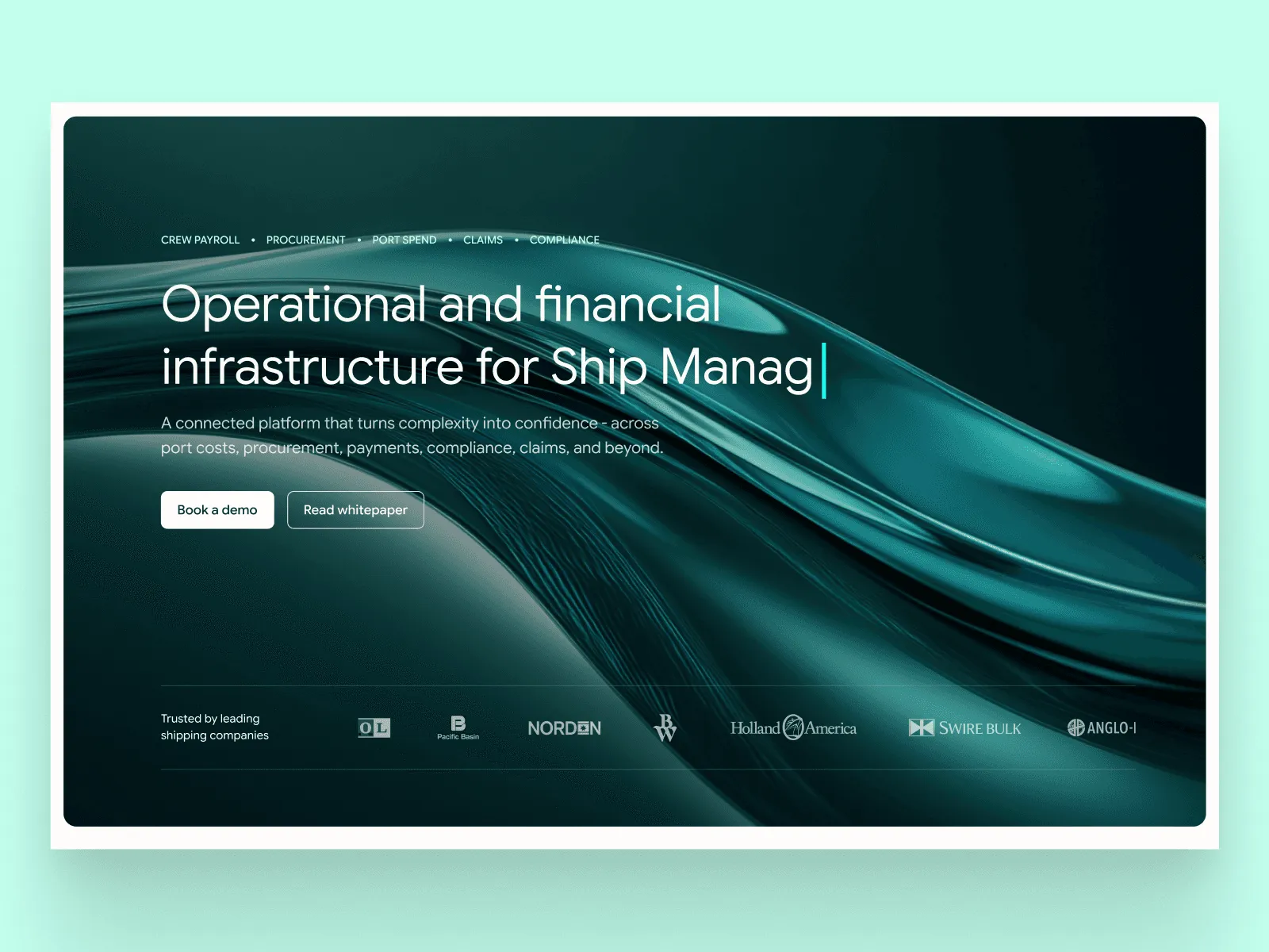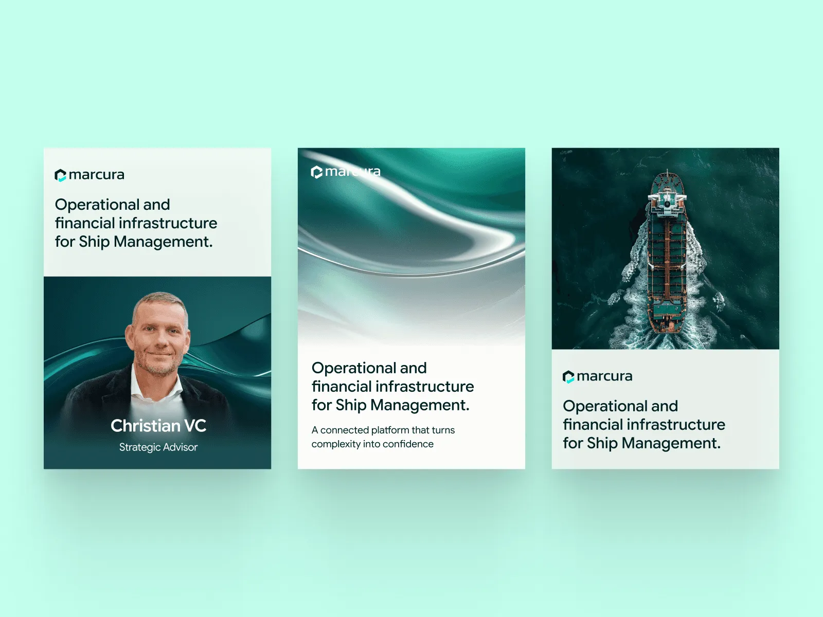 Strategy. We diagnosed the problem as one of category caliber rather than visual fashion. Maritime tech competitors all look identical — container ship stock, blue palettes, 2015 digital-transformation language. We positioned Marcura as the first maritime tech platform that doesn't look like maritime tech: calm, editorial, enterprise-grade restraint.