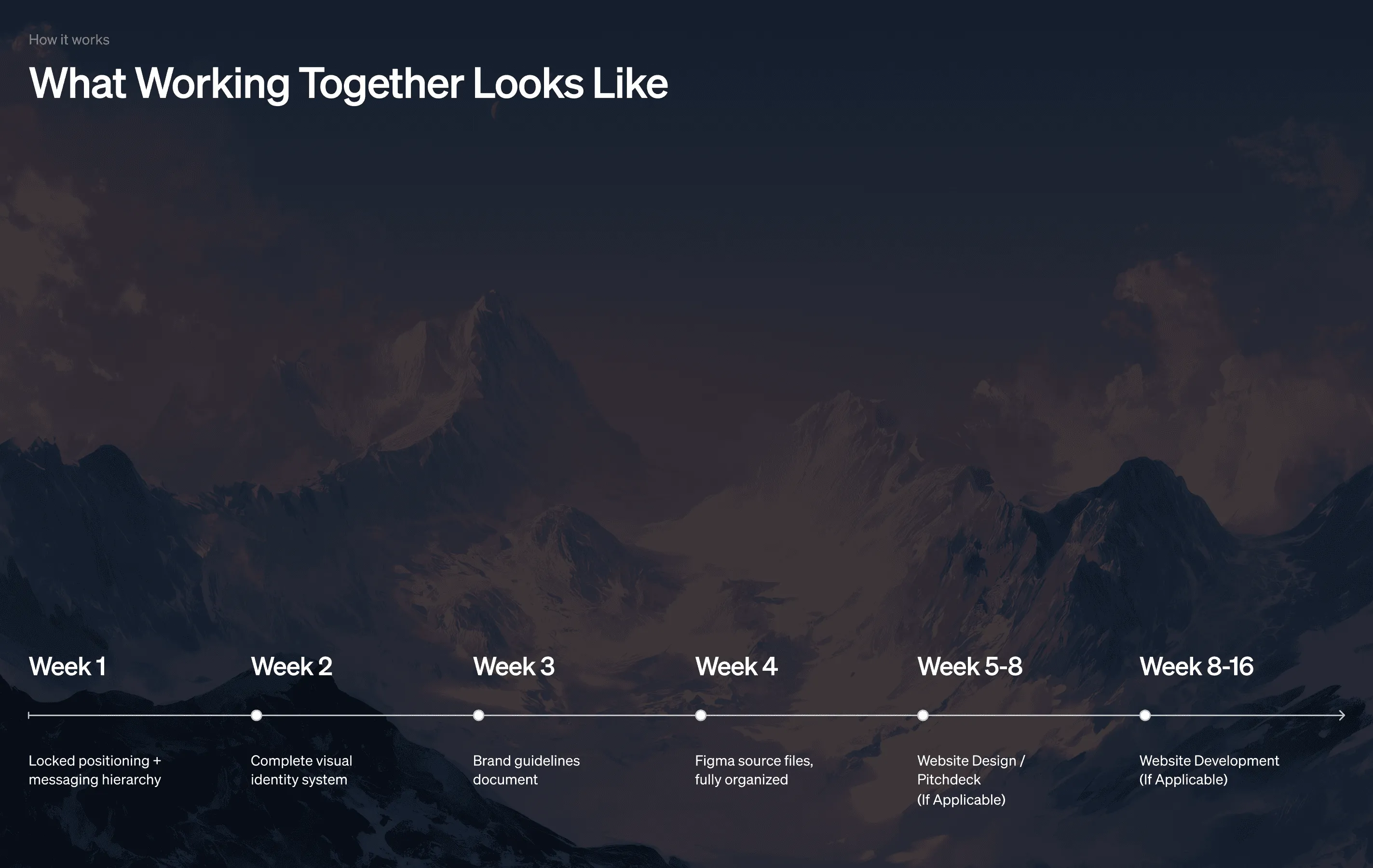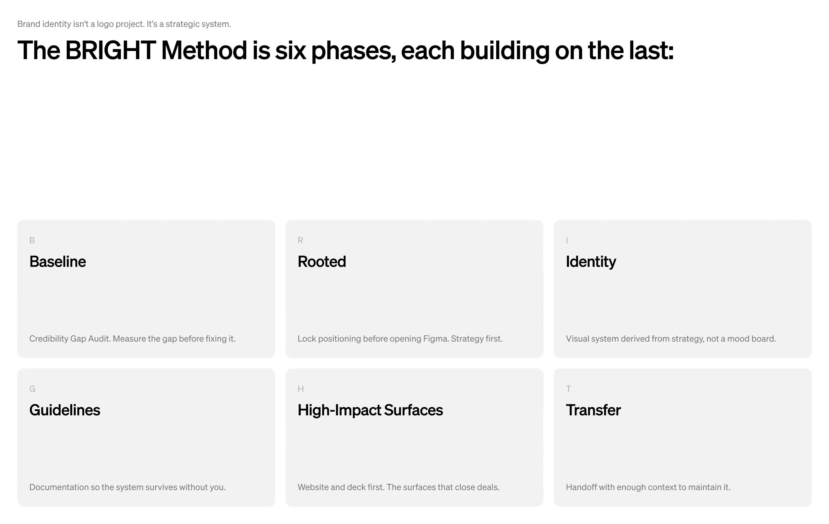 Most agencies hand off a guidelines PDF and disappear. A brand that exists only in a guideline document doesn’t exist — it’s a receipt for a purchase. Home makes the brand real on the two surfaces where every deal actually moves: your website and your deck. Everything else — social, email, events — is downstream. Website and deck are the mandatory beachheads.